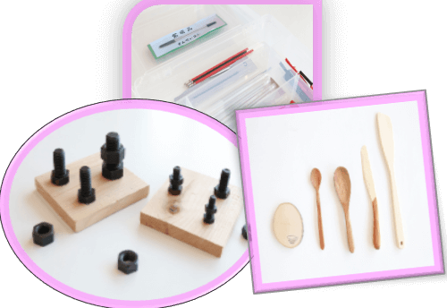 色や数字、ロゴなど物をマッチさせる課題や、指先を使った作業を促す課題、パーツごとに仕分けをする課題など、